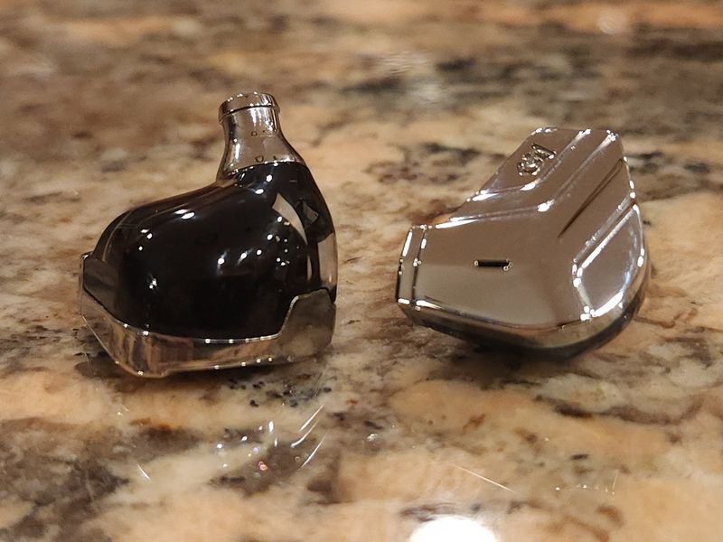 Astro’s shell is relatively lightweight, surprisingly compact, and quite comfortable to wear.  It has a 3D-printed polymer body and a full CNC billet mirror-finish polished stainless steel faceplate and nozzle with pre-drilled holes.  The faceplate has a cool modern art design with a layered stepped effect and an etched CA logo.  The polymer body of the shell has limited transparency, allowing you to see the outline of internal chambers as you bring these closer to the light and rotate to catch the view.  And as expected, you will find a solid-build mmcx connector socket.