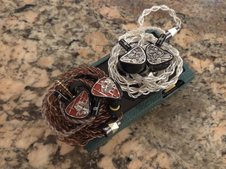 Eletech Aristotle (copper) vs Eletech Euclid (silver with gold) – Euclid is very close to stock cable, just with a touch more body in the mids. At the same time, Aristotle adds a bit more rumble to the sub-bass, making the bass a bit slower, and extra sparkle to the treble.