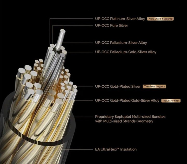 Unlike the original Centurion, which used only UP-OCC Gold-Plated Gold-Silver Alloy, CII uses UP-OCC Platinum-Silver Alloy, Gold-Plated Gold-Silver Alloy, and Gold-Plated Silver. There are 8 wires in total, each 24 AWG in thickness, using a proprietary septuplet multi-sized bundles with multi-sized strands geometry. The transparent sleeve of the cable uses EA UltraFlexi insulation.